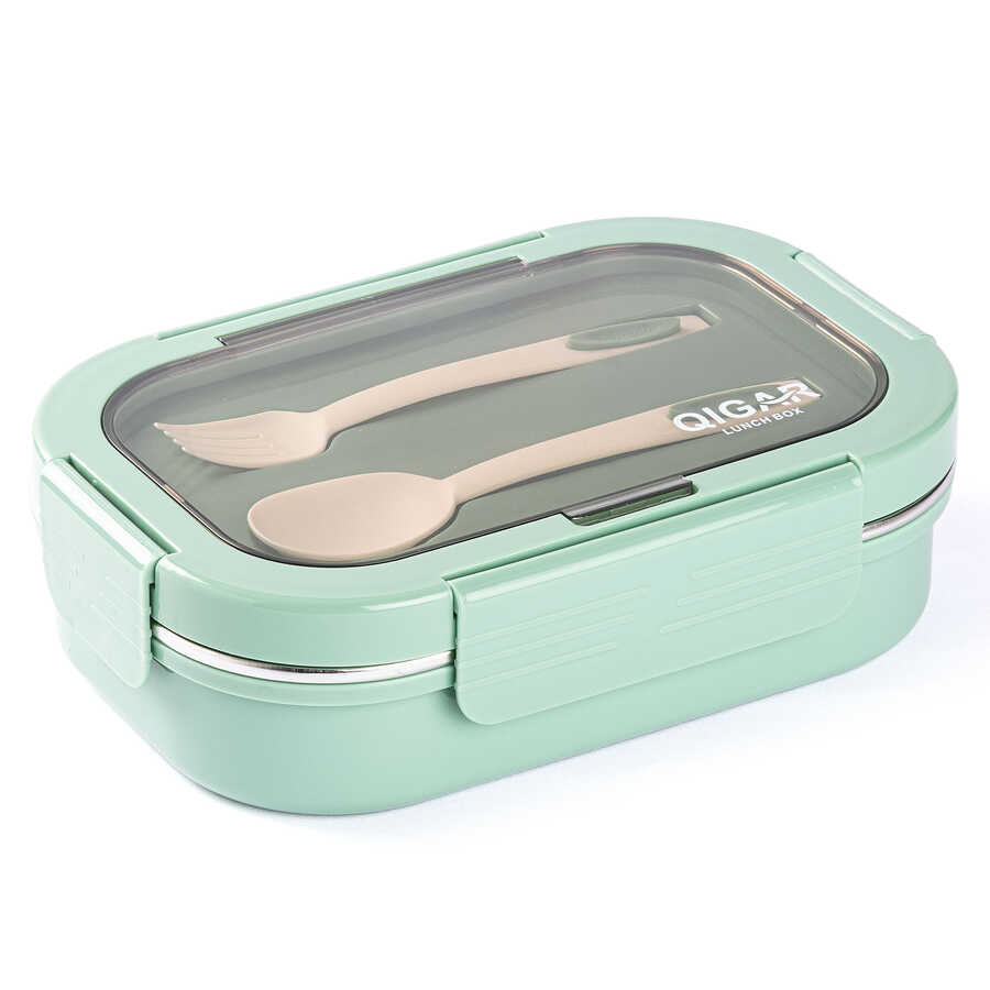 3 BÖLMELİ ÇATAL KAŞIKLI YEŞİL PASLANMAZ ÇELİK DİKDÖRTGEN YEMEK TAŞIMA KABI 750ML